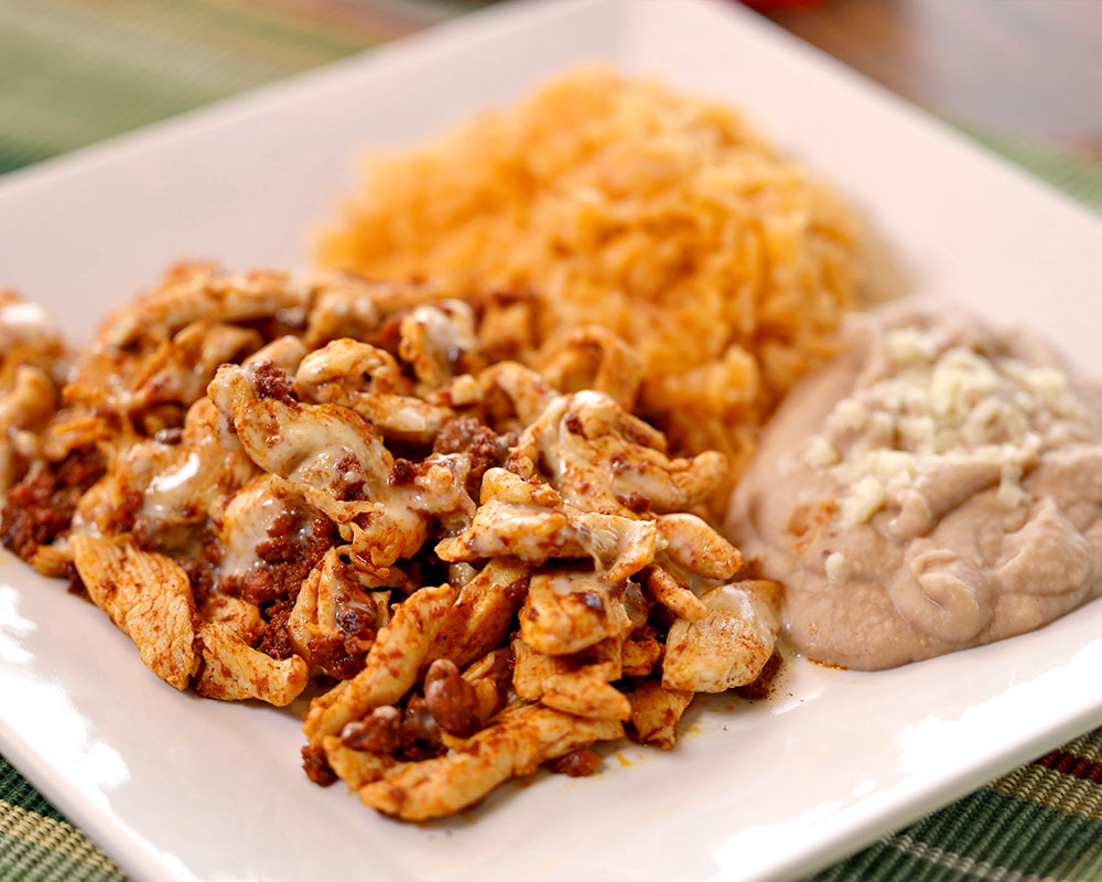 Two quesadillas, one marinated chicken and one beef tips. Drizzled with cheese sauce and served with Spanish rice. CHORI-POLLO 17.50 Grilled chicken strips with Mexican sausage (Chorizo) topped with cheese sauce. Served with spanish rice, refried beans and flour tortillas.