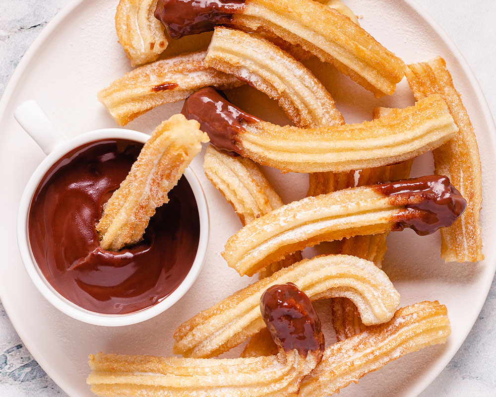 Churros made into a bowl, then lightly fried and rolled in sugar and cinnamon. Served with a vanilla ice cream ball inside the bowl, topped with chocolate, whip cream and a maraschino cherry.