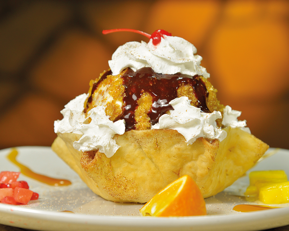 FRIED ICE CREAM 6.99 A vanilla ice cream ball coated in frosted flakes and then lightly fried. Served inside a crispy flour tortilla bowl, topped chocolate, whip cream and a maraschino cherry.